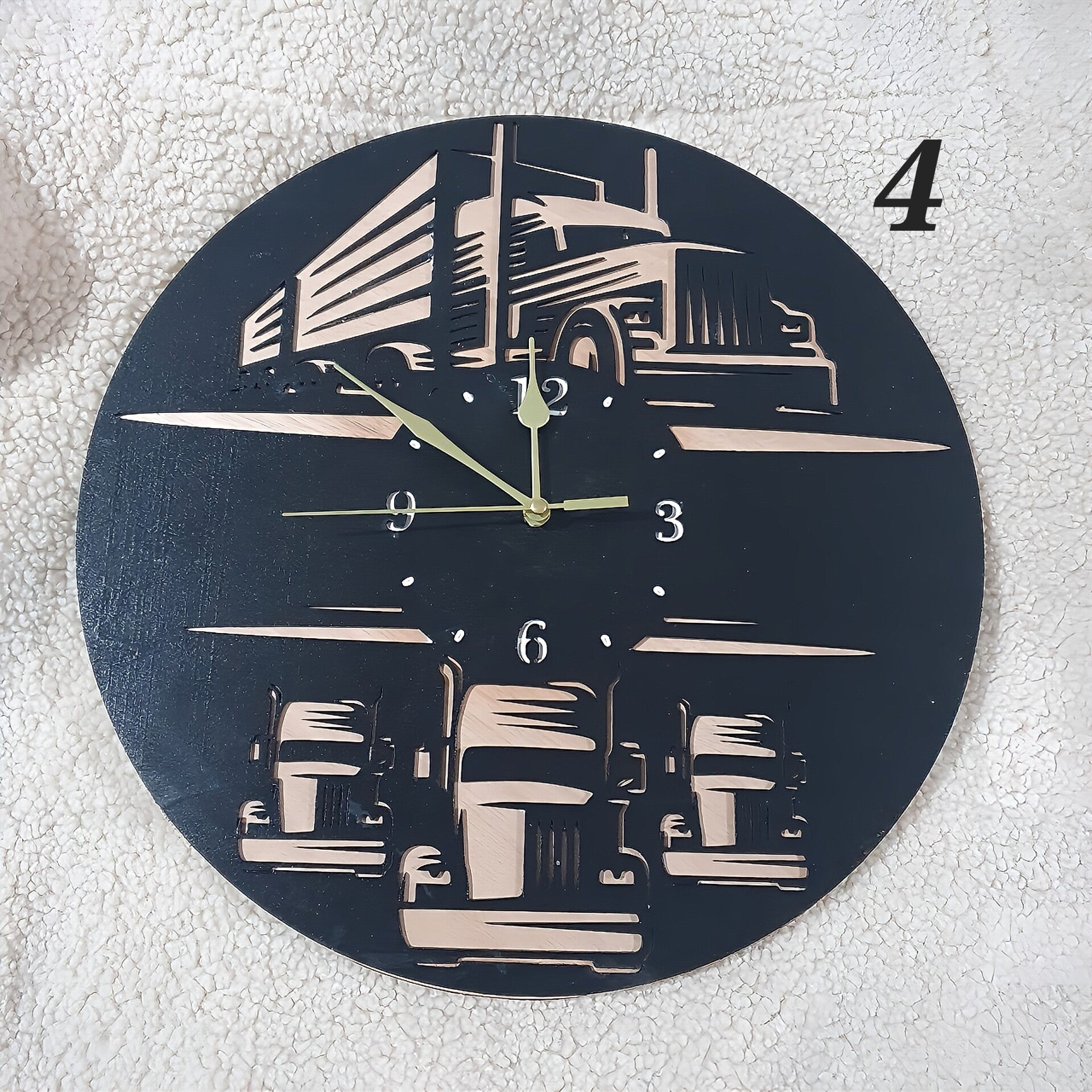 Découpe et gravure sur bois, peinture noire mate, mécanisme silencieux.